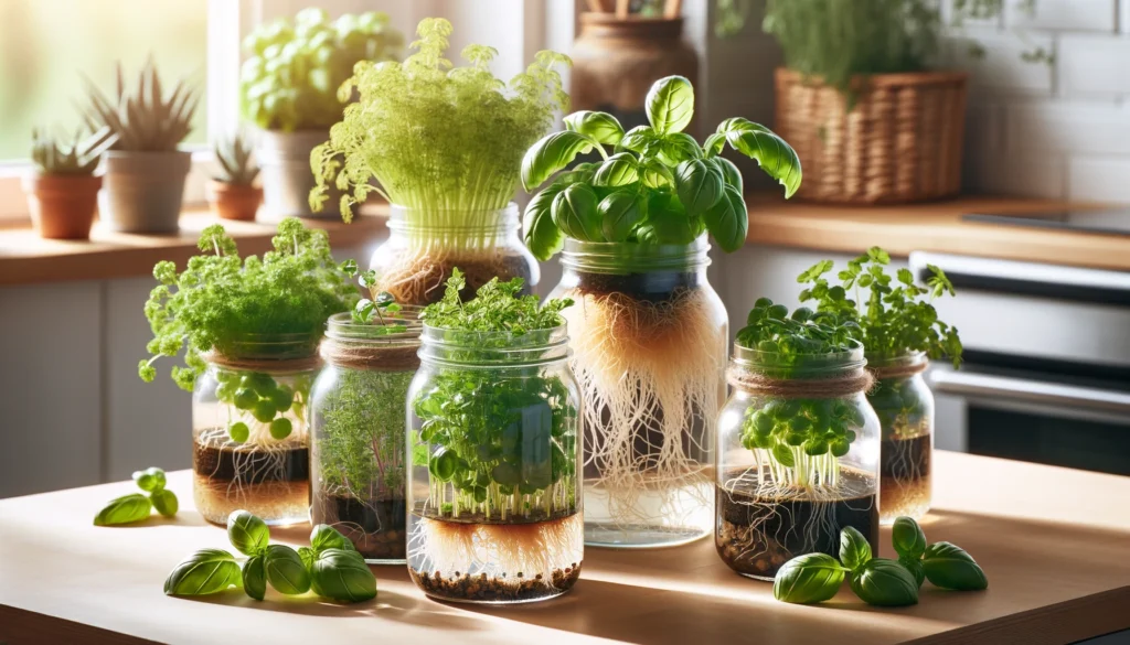 | Jars | Herbs, small plants | Visible roots, easy to manage | Need light cover |